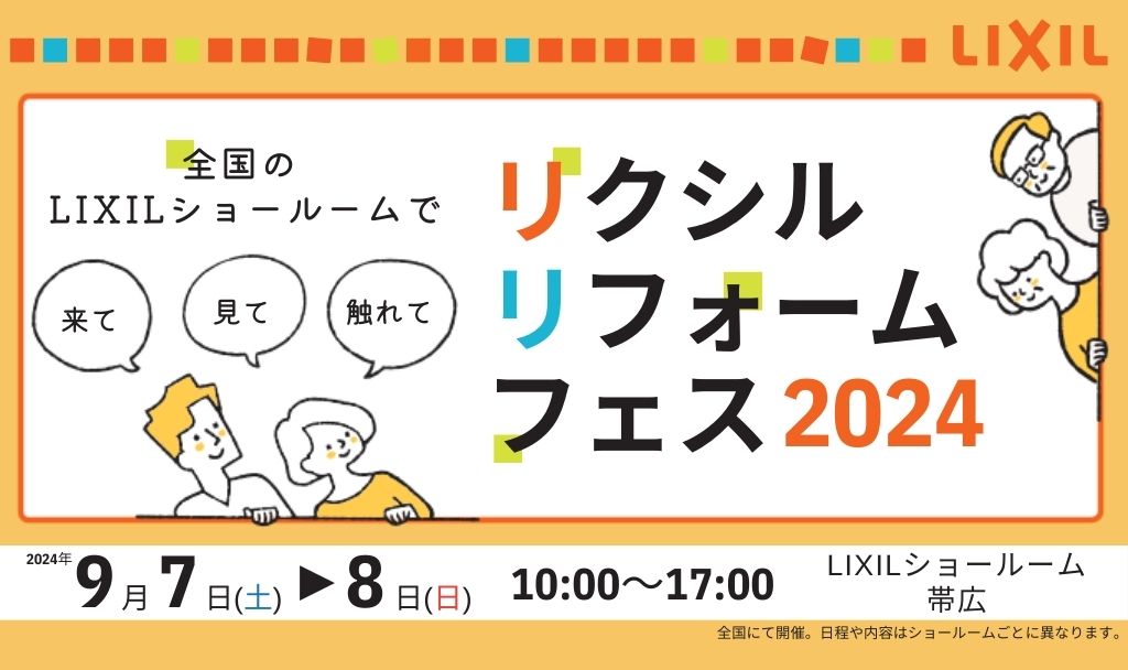 終了 住まいの悩み、聞かせてください!リフォーム体験会 会場 LIXIL帯広ショールーム 〒080-0010 北海道帯広市大通南24丁目15番地 開催日時 2024年7月7日(日) 10:00~17:00 参加費 無料
