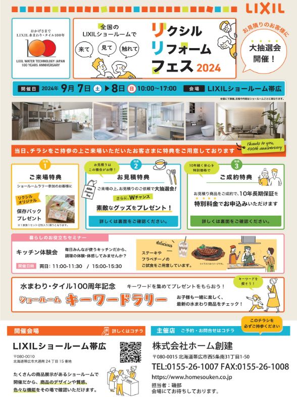 - 2024年9月7日(土)~8日(日) 10:00~17:00 (会場:LIXIL帯広ショールーム) 詳しくはこちら >