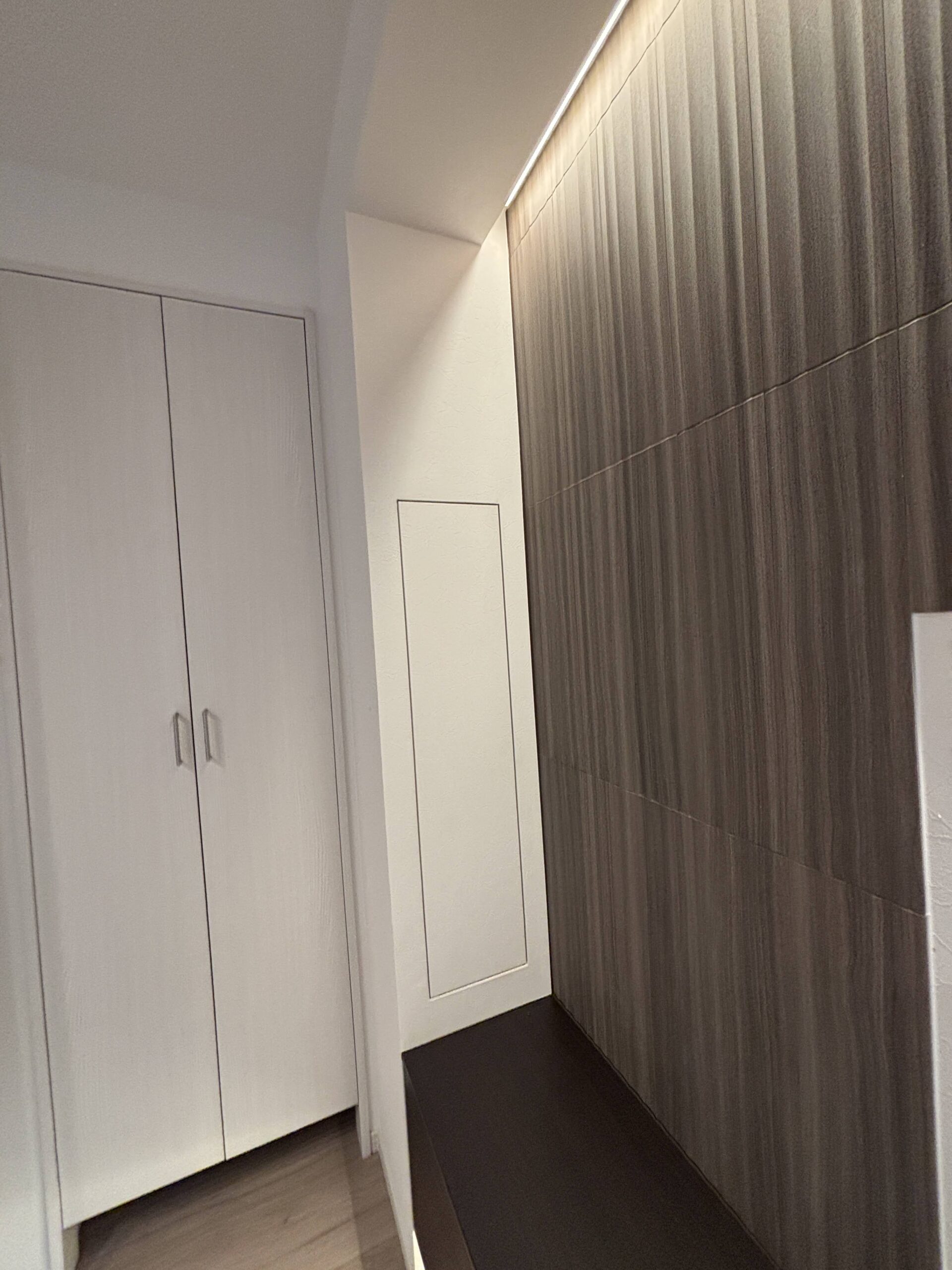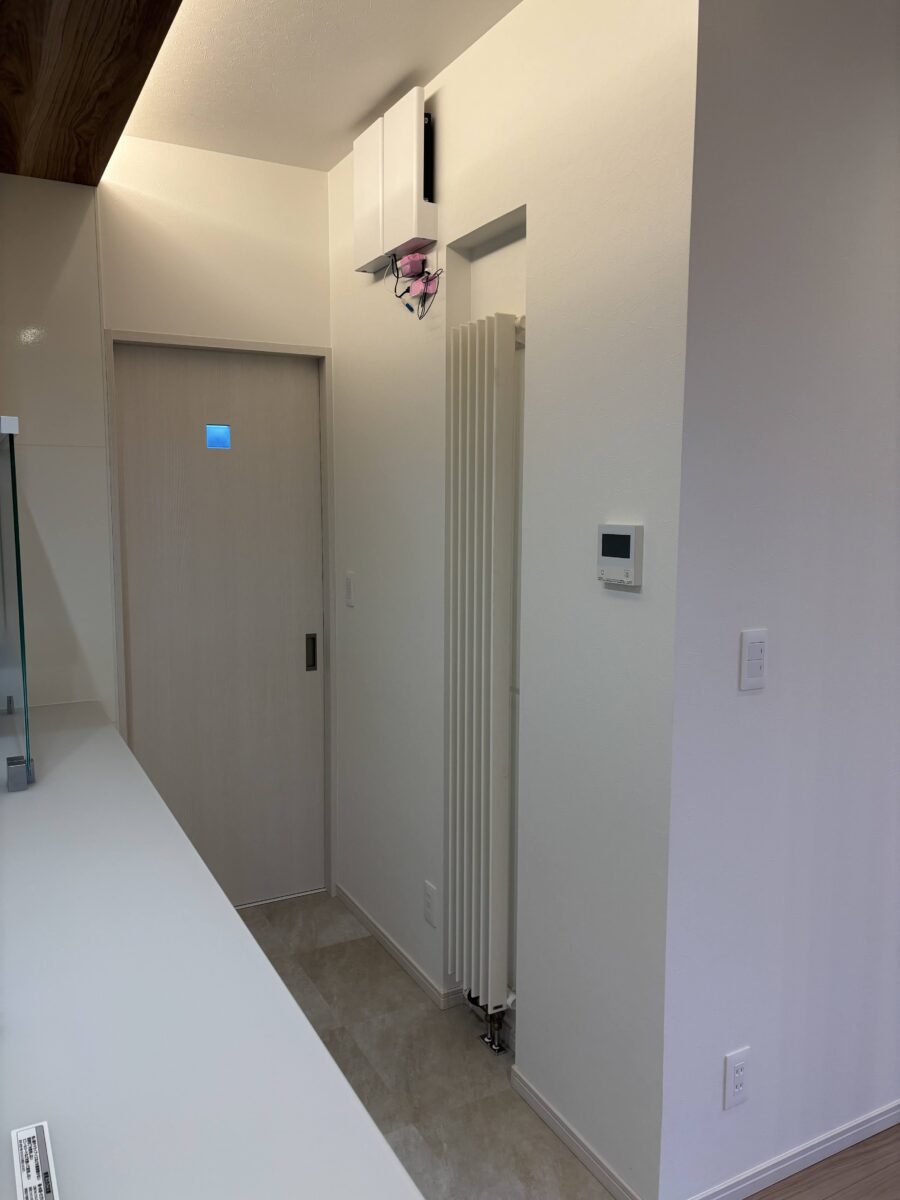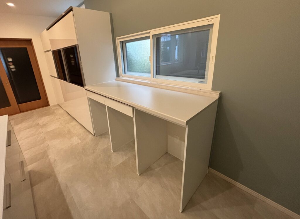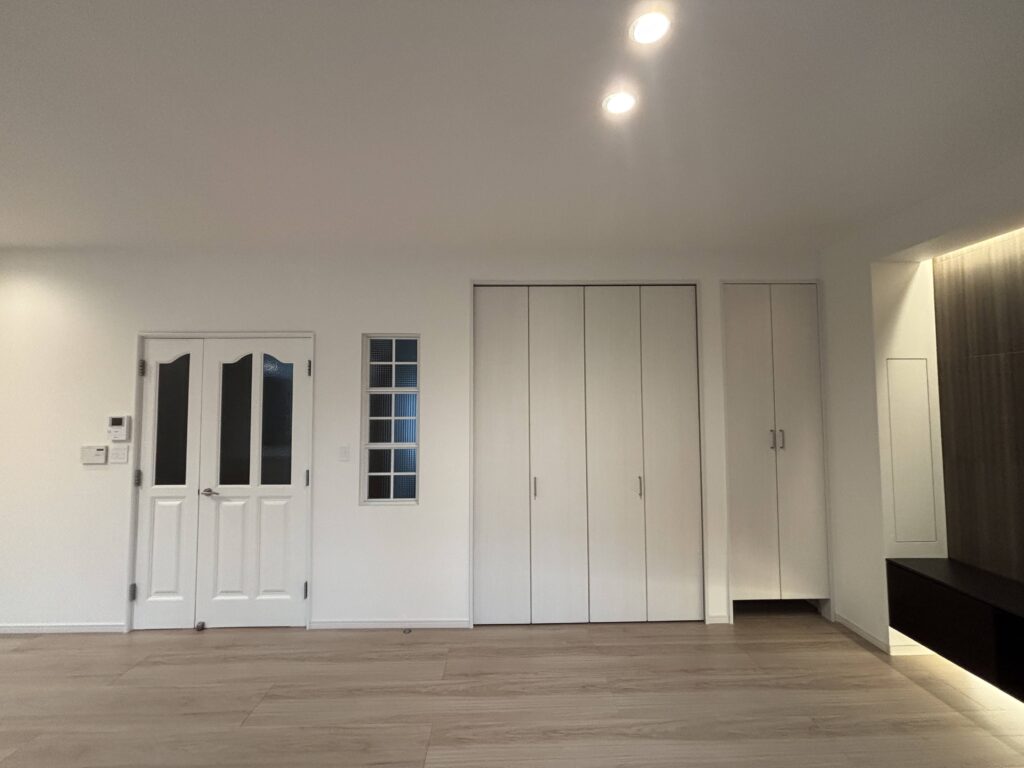 今回のリフォームでは、改装する部分と既存のまま活かす部分が同じ空間の中にありました。そのため、後から「やっぱりここも直しておけばよかった」と感じることのないよう、空間全体に一体感が生まれるような工夫を心がけました。特に内装仕上げにおいては、既存部分との取り合いに違和感が出ないよう、建具の一部を塗装仕上げにするなど、細やかな配慮を加えています。 また、「テレビの近くに電気製品の取扱説明書などをしまえる収納が欲しい」というご要望には、収納扉の存在感を抑え、空間の雰囲気に馴染むような納まりを工夫しました。 キッチンについては、対面側にも収納が付いたタイプを採用。通路を広く確保できるよう、暖房のパネルヒーターは壁に埋め込む形で設置しています。さらにその上部には、ネットのルーターなどをすっきりと収められるよう、視線に入りにくい場所に収納スペースを設けました。 なお、2階にお住まいのまま進めるリフォーム工事であったため、日々の暮らしへのご負担をできる限り軽減できるよう、作業時間や清掃にも配慮しながら進行いたしました。 また、工事期間中は施主様に駐車スペースのご協力もいただき、近隣の方々へのご迷惑が最小限となる様、注視して工事をさせて頂きました。