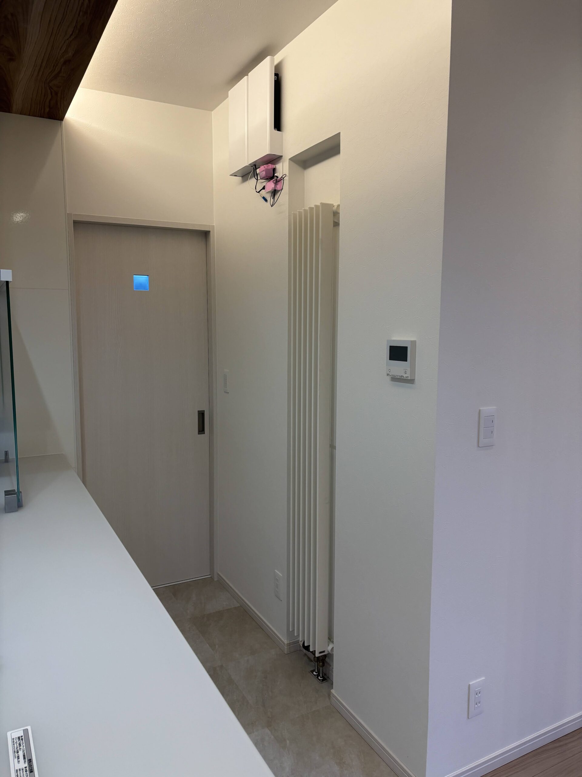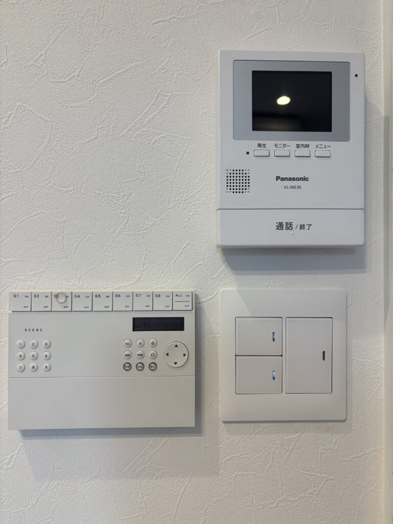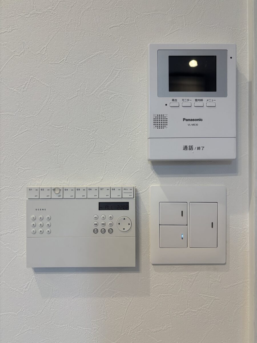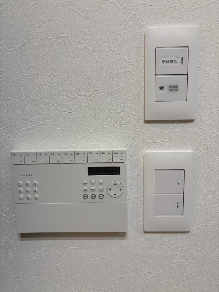一部の間接照明とダウンライトには、Bluetoothで調光・調色ができる照明器具を採用。壁面から取り外せるリモコンを採用しました。最大8グループ・9パターンの照明設定を簡単に操作できる、使い勝手の良い優れた商品です。