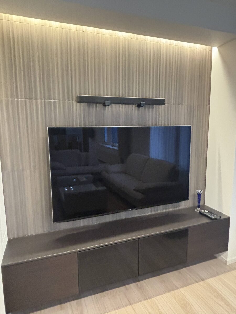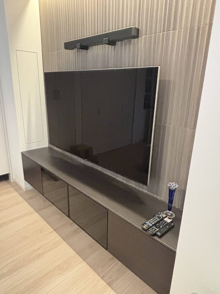 テレビ設置後、お客様ご自身で上部にスピーカーを取り付けられたそうです。インテリアに馴染むこだわりの配置で、空間がさらに素敵に仕上がっています。