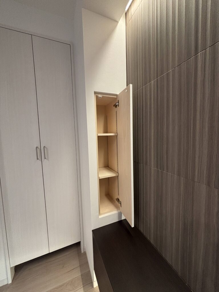 テレビキャビネットの横に、電化製品の説明書などを収納できるスペースを設けました。壁と同じクロス仕上げの扉で、見た目もすっきりとしています。