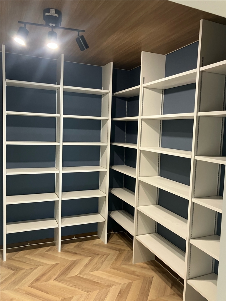 ご主人のご趣味である漫画の収納についても、壁2面分を使った造作可動棚をご提案し、たっぷり収納できる空間に仕上げました。